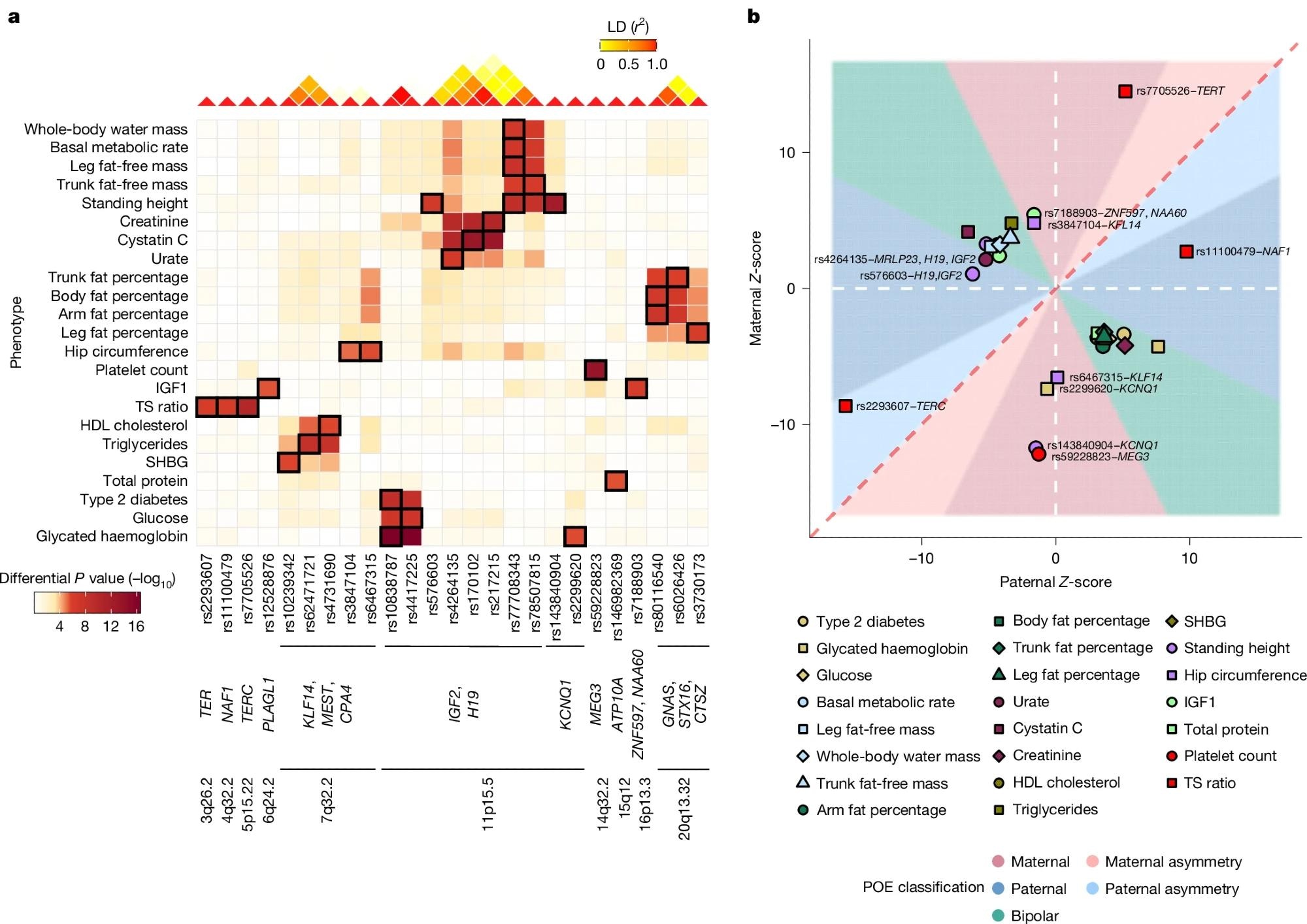 a, Heatmap summarizing the differential P value for all significant POEs identified in this study, computed using REGENIE (two-sided test). Columns correspond to genetic variants ordered by genetic position and annotated with the genes and chromosome bands, whereas rows represent phenotypes. The colour intensity represents the magnitude of the differential P value, with darker shades indicating stronger differential effects. Cells with black rectangles indicate significant POEs identified in this SNP–trait pair and reported in Table 1. The linkage disequilibrium (LD) heatmap (top) shows the linkage disequilibrium (r2) between the variants. b, Scatter plot illustrating the parental Z-scores for all significant POEs identified in this study and reported in Table 1. Each point represents a significant POE, coloured and shaped by phenotype. The dashed red line represents the line of equality, and the dashed white lines represent zero values for paternal and maternal Z-scores, respectively. Areas are filled according to the POE classification. Labelled points correspond to POEs classified as paternal or maternal effects. Unlabelled points correspond to bipolar POEs.a, Heatmap summarizing the differential P value for all significant POEs identified in this study, computed using REGENIE (two-sided test). Columns correspond to genetic variants ordered by genetic position and annotated with the genes and chromosome bands, whereas rows represent phenotypes. The colour intensity represents the magnitude of the differential P value, with darker shades indicating stronger differential effects. Cells with black rectangles indicate significant POEs identified in this SNP–trait pair. The linkage disequilibrium (LD) heatmap (top) shows the linkage disequilibrium (r2) between the variants. b, Scatter plot illustrating the parental Z-scores for all significant POEs identified in this study. Each point represents a significant POE, coloured and shaped by phenotype. The dashed red line represents the line of equality, and the dashed white lines represent zero values for paternal and maternal Z-scores, respectively. Areas are filled according to the POE classification. Labelled points correspond to POEs classified as paternal or maternal effects. Unlabelled points correspond to bipolar POEs.
