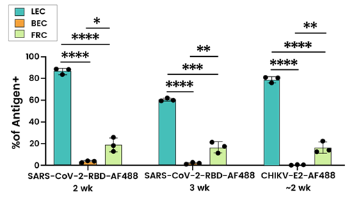 Figure 3. Quantification of the frequency of LEC, BEC, and FRC in the popliteal lymph node (pLN) that are positive for the recombinant SARS-CoV-2 RBD and CHIKV-E2 antigens (Sino Biological, 40440-V08B) administered with polyI:C and αCD40 at indicated time 11. Image Credit: https://pmc.ncbi.nlm.nih.gov/articles/PMC10957963