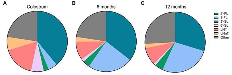 ![Relative abundance of the six core HMOs in breast milk between 0 and 12 months of age. Ratios of the six individual HMOs were calculated in relation to total HMO concentration. Ratios were calculated by taking the quotient of average individual HMO levels divided by average total HMO level at the respective timepoint and multiplying by 100%. “Other” was calculated as 100% - [Sum % of 2′-FL, 3-FL,3′-SL, 6′-SL, LNT, LNnT]. (A) Colostrum, (B) 6 months, (C) 12 months.](https://appetitesciencelab.com/images/news/ImageForNews_818597_1757378468615770.jpg)