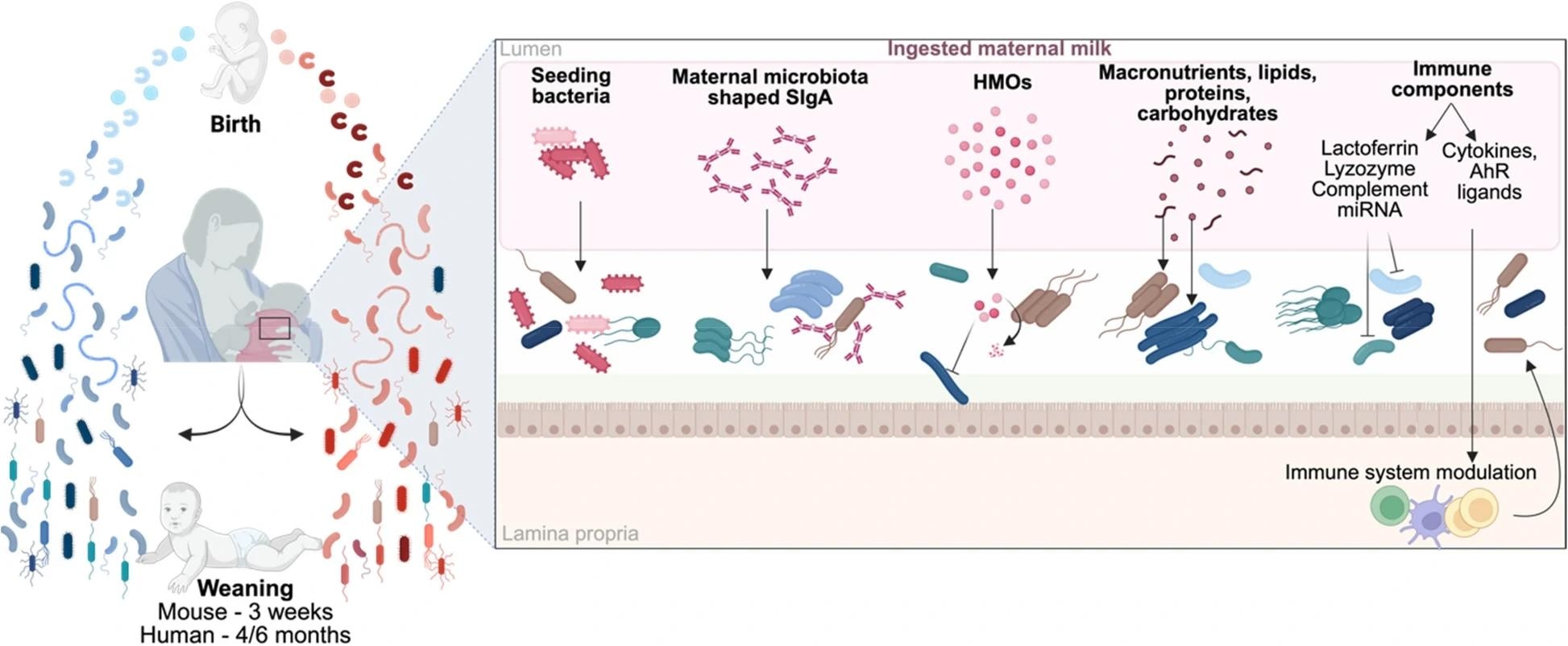 Impact of maternal milk components on microbiota establishment. Maternal milk plays a crucial role in the development of the offspring