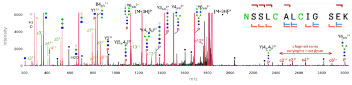 With OmniScape version 2026, Bruker introduces significant improvements for its proteomics de novo workflow. Notable advancements encompass the residue-specific score and visualization via a confidence sequence heatmap for results validation. In addition, the unique advantage of electron-based activation (ECD, EXD, and EID) on the timsOmni has been demonstrated for comprehensive glycopeptide analysis. Extended glycan structures were preserved on the peptide backbone, allowing further investigation into biologically highly relevant glycopeptide topology through MSn experiments (Figure 2). The versatility of timsOmni enables scientists to precisely localize glycan moieties and gain detailed insights into PTMs, advancing both structural and functional understanding of biological networks.