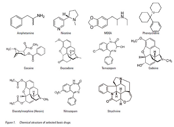 For the experiment the standard 28 drug mix of forensic/toxicology check mix was used. The compounds in the mix contained both early and late retention rates and contained different categories of compounds such as alkaloids, amphetamines and benzodiazepines.