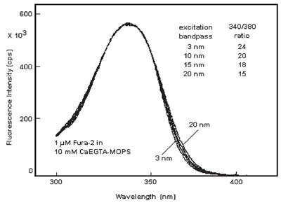 In order to measure pH or intracellular [Ca++] using BCECF or Fura-2, respectively, 2 or 3nm bandpass is normally used on the monochromators of the PTI DeltaScan illuminator. Figure 2 shows the effect of increasing bandwidth of the excitation light on the 340/380nm fluorescence ratio.