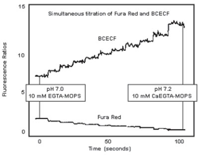 Moreover, the two parameters pH and [Ca++] must be measured independently, despite the spectral overlap between their emission spectra and fluorescence excitation.
