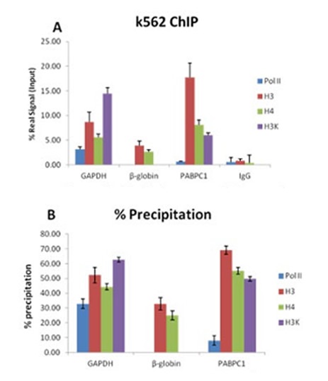 Figure 5: Multiple target ChIP onto human gene promoters in  Leukaemia carcinoma cells. (A) % real signal relativeto Input (B) % precipitation of the input sample.