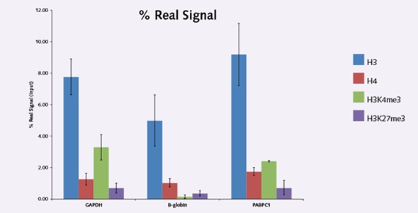 Increased real signal relative to the input chromatin was identified for H3K27 and H3K4 tri methylation at each of the gene loci examined in this study, while the assay’s efficiency was monitored through highly abundant H3 screening as a positive control (Figure 2).