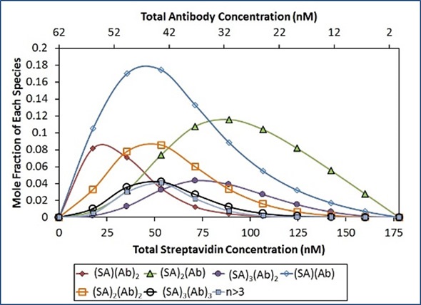 In line with this model, Ab binds to SA with an affinity (Kd) of 22 nM, and the [(SA)(Ab)] base units self-assemble with a Kd of 50 nM. To completely capture the difference in light scattering as a function of composition, an additional term representing two antibodies that bind a streptavidin molecule (SA)(Ab)2 was required. No obvious concentration of [(SA)(Ab)]n complexes is available with n>3 under these conditions, as illustrated in Figure 5.
