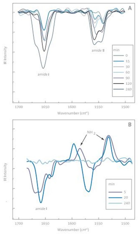 BLG’s adsorption to the DMPA monolayer was examined using the PM-IRRAS spectrometer as a function of time (Figure 5A). The typical DMPA (CH2 scissor) peaks in 3000cm-1 region were found to be positive and the typical bands for amide II (NH bending), amide I (C=O stretch) and polypeptides were found to be negative.