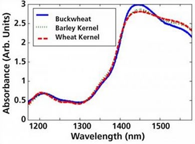 Figure 2. The NIR spectra of buckwheat, barley, and wheat grains differ above 1400nm, enabling spectroscopic identification.