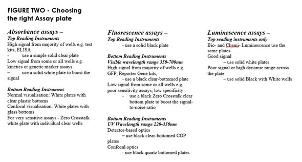 The microplates used in HTS and assay development are usually made from polystyrene polymer. Titanium dioxide (TiO2) serves as an optical brightener which is added to this polymer to enhance the surface reflectivity of white plates. The tools used to mould these plates are also well polished to ensure a very bright, smooth surface within the wells. These measures are taken to ensure that the generated light inside the wells is reflected towards the top of the micro well. This is where the highly sensitive optical detector of the measuring instrument is positioned at the time of the reading cycle. Ideally, a photodiode detector or photomultiplier would capture most of the light generated and reflected in this way. In the case of fluorescence measurements, it is essential to quench the auto-fluorescence emitted by the polystyrene substrate and this can be achieved by adding 1% carbon black to the polystyrene. Such an approach has proved highly effective in fluorescence assays and provides better results when compared to a white plate. In order to improve reflectivity, all the interior surfaces are again also polished.