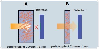 Microliter measurement systems help eliminate the need for serial dilutions due to their ability to measure highly concentrated samples in their undiluted state. Measurements on such systems can be made with just a few microliters of the sample. These systems employ a shortened light path for taking measurements. Figure 1 compares the measurements taken using a normal cuvette against those taken by a microliter cuvette. It can be seen that in case of a normal cuvette that has a 10mm light path, the light is blocked by a sample of a specific concentration, and it cannot reach the detector. However, in a microliter measurement cell with shortened path length, the light passes through the sample and reaches the detector. The concentration of the sample is a function of the abbreviated light path.