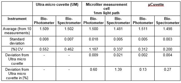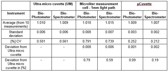 It can be seen from the µCuvette results that the values were in line with the expected results, and also with the measurements acquired with the ultra-micro cuvette. This means that the µCuvette has a lower deviation when compared to a competing microliter measurement cell. Such low standard deviations imply that the µCuvette can provide a high degree of precision in measurements.