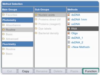 Figure 2. Selection of the RNA method for the purpose of verifying the RNA stock solution via absorbance measurements. Photometric as well as fluorimetric methods are available on the Eppendorf BioSpectrometer fluorescence.