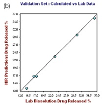 The R2 and the standard error of calibration (SEC) values for the resulting model for 1 hour were 0.9972 and 0.3165, respectively. The standard error of prediction (SEP) for the selected samples was found to be 0.416, with 0.4221 as standard error of cross validation (SECV), good predictability was demonstrated by the one-left-out cross validation. The plot of the NIR predicted percent drug (propranolol) released against the actual drug dissolution results for the hour 1.0 calibration set is depicted in the left hand plot of Figure 4.