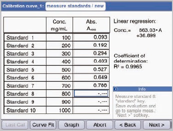 On establishment of the standard curve, initiation of sample measurement takes place immediately. The “Next” soft key directly leads to the area of measurement. Figure 12 shows an example of a sample measurement. The resulting measurement of the sample is directly displayed within the curve’s standard in Figure 12. This shows the range of standards selected coherently for sample determination.
