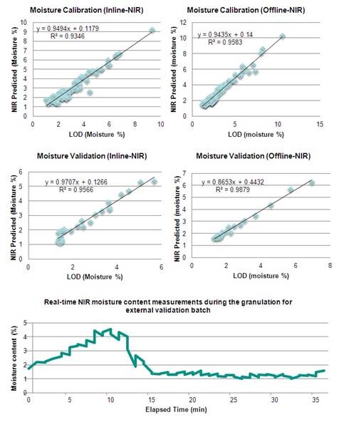 The two images given at the bottom of Figure 4 demonstrate real-time NIR predictions made for the granule mean diameter as well as for moisture content throughout the entire granulation process during one specific validation batch.