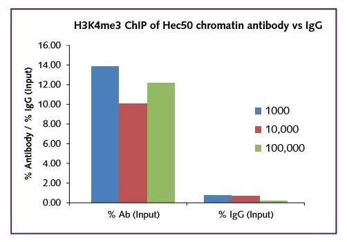 Regardless of the starting cell number (1000, 10,000, 100,000), the real signal was comparable within the range 10-14% for this target. In all cases a low background IgG in was recorded. The low binding of H3K4me3 to the negative gene target ß-globin further shows the selectivity of the assay (Figure 2).