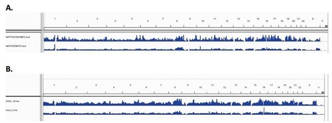 Figure 3. Enrichment peak maps of H3K4me3 across the whole genome (A) N-ChIP (B) X-ChIP
