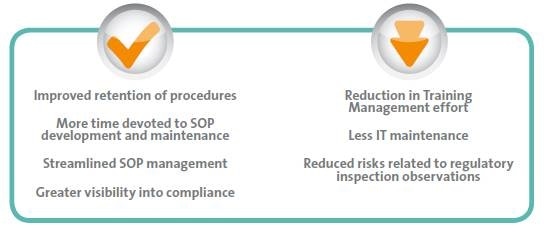 Today’s technology advances enable companies to leverage best-of-breed LMS and DMS applications to ensure seamless SOP management and training. In order to enhance productivity of all job roles of the process, the top 10 capabilities of well-integrated, modern solutions include: