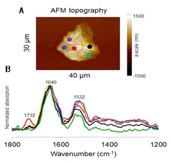 Local lipid concentration corresponding to that of the proteins is evident by monitoring the variation in the band ratio between the methylene C-H (2800–3000 cm-1) and the amide-A (3290 cm-1) stretching bands. Moreover, differentiating localized lipid regions (1732 cm-1) from proteins (1650 cm-1) in corresponding AFM-IR images can now become easier.