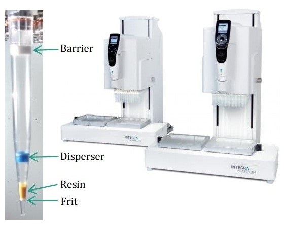The Integra system is loaded with well plates containing hydrolyzed urine samples. Then, pre-filled well pates for elution solvent and water wash are mounted into the Integra, and 30% methanol is aspirated from a solvent reservoir to condition the DPX tips.