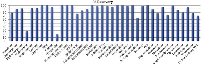 From beginning to end, the semi-automated dispersive SPE method takes less than 10 minutes to prepare a single 96-well plate. This method provides reproducible, accurate, and linear results. It was observed that all correlation coefficients were more than 0.99 for the range of 12.5-400 ng/mL, with the majority of analytes being linear from 6.25 to 800 ng/mL.