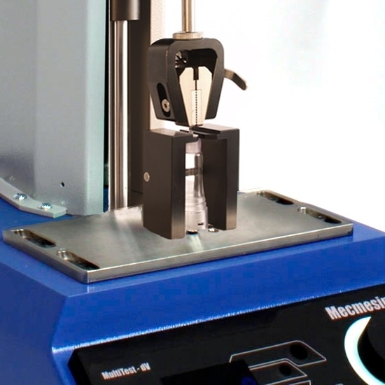 The plastic base is positioned below a custom-engineered mounting block, with the vertically aligned tip of the needle uncovered. A lever-operated pin vice is fitted to the end of the needle, and a tensile load is applied to the top at a rate of 200 mm/min until the needle is dislodged. For 8 years this durable system from Mecmesin has been in constant use.