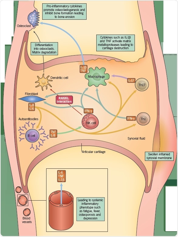 Antigen-activated T cells generate pro-inflammatory cytokines, such as IL-17, which stimulate macrophages, monocytes, and synovial fibroblasts into producing additional pro-inflammatory cytokines, IL-1, IL-6, and TNF-α. This causes the recruitment of further immune cells, such as B cells and NK cells, which consequently secrete, respectively, immunoglobulins, such as rheumatoid factor, and IFN-γ. These combined proinflammatory cytokines make an overall contribution to the articular inflammation. Moreover, the stimulation of fibroblasts, lymphocytes, and macrophages can cause angiogenesis, which might account for the heightened vascularity observed in the synovium of RA patients.