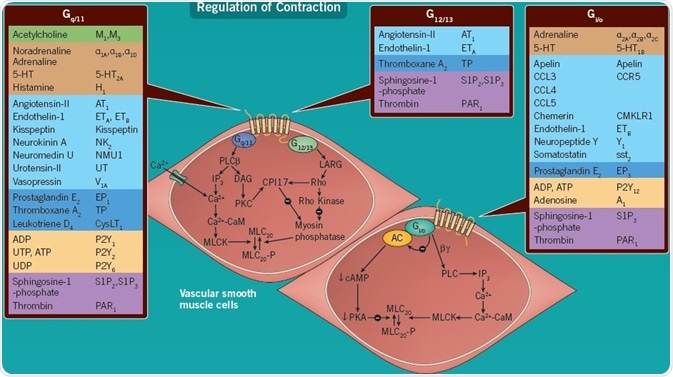 Moreover, the endothelium is the source of locally functioning endothelium-derived contracting factors, including urotensin-II, thromboxane A2, and ET-1, mediators that can resist the actions of endothelium-derived vasodilators to support the maintenance of basal tone[9]. Smooth muscle GPCRs also react to nucleotides and eicosanoids released locally from the perivascular nerves or endothelium, as well as to circulating constrictor hormones, such as adrenaline.