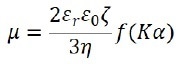 Where ε0 represents the solvent dielectric constant in vacuum, εr stands for the relative dielectric constant, η indicates the solvent viscosity, f(Κα) signals the Henry function, Κ is the reciprocal Debye length, α represents the particle radius, and Κα refers to the ratio between the thickness of the double layer and the particle radius.