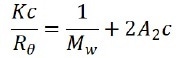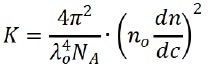 Where c represents the sample concentration, θ is the detection angle, Rθ indicates the Rayleigh ratio that is used to determine the intensity ratio between the scattered light and the incident light at angle θ, Mw marks the sample’s weight-average molecular weight, and A2 is associated with the second light scattering virial coefficient. K signifies constant and can be expressed as: