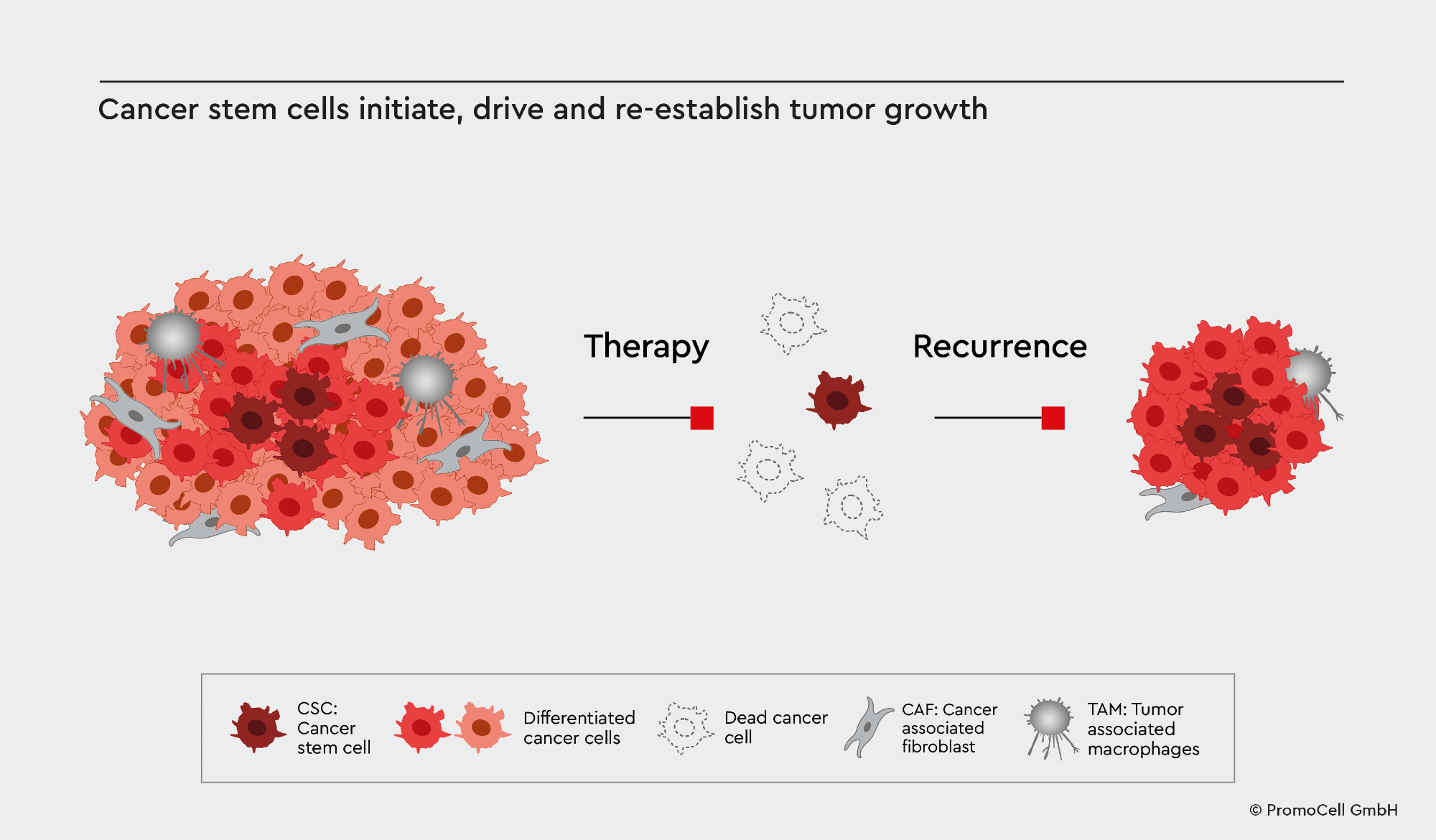 Figure 3. Cancer stem cells initiate, drive and re-establish tumor growth. The resistance of CSCs to conventional treatment leads to cancer recurrence in the majority of tumor patients after conventional therapy. Image Credit: PromoCell