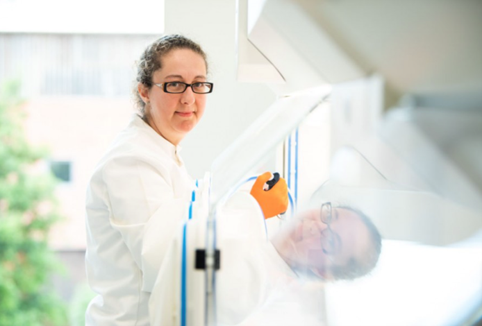 Researcher using the portable microplate reader (Byonoy – Absorbance 96) in an anaerobic chamber. Image Credit: Lablogic