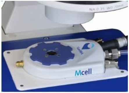 The Mcell allows efficient use of the GenRH-A humidity generator with a microscope. The sample is placed into the Mcell, which is integrated into the microscope stage as illustrated in Figure 2.