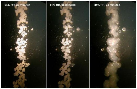 Figure 3. Photographs of the Coffeemate powder at 64%, 81% and 85% RH, taken at 25°C and 40X magnification