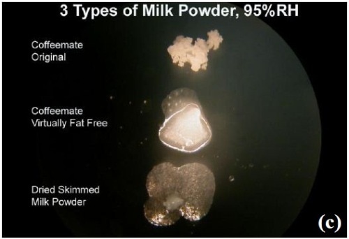 The similar dried samples of three different milk powders, namely Coffeemate Original, Coffeemate Virtually Fat Free, and freeze-dried, skimmed milk, were fed into the microscope slide in a fashion at right angle to the direction of gas flow. They were then subjected to varying humidity levels of 30% to 95% RH, and then at 95% RH for 80min.
