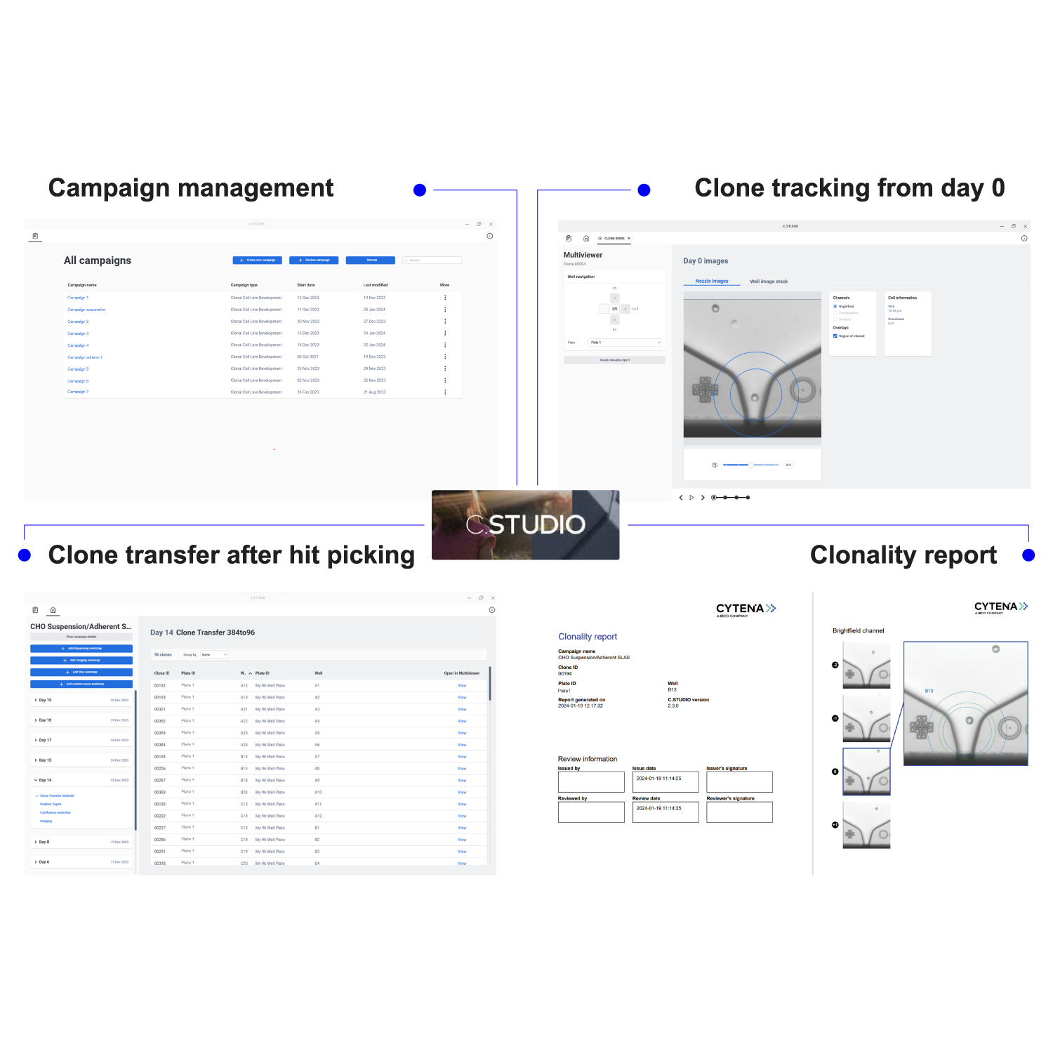 - Plate imaging and C.STUDIO image analysis allow for colony tracking and clone characterization over time.