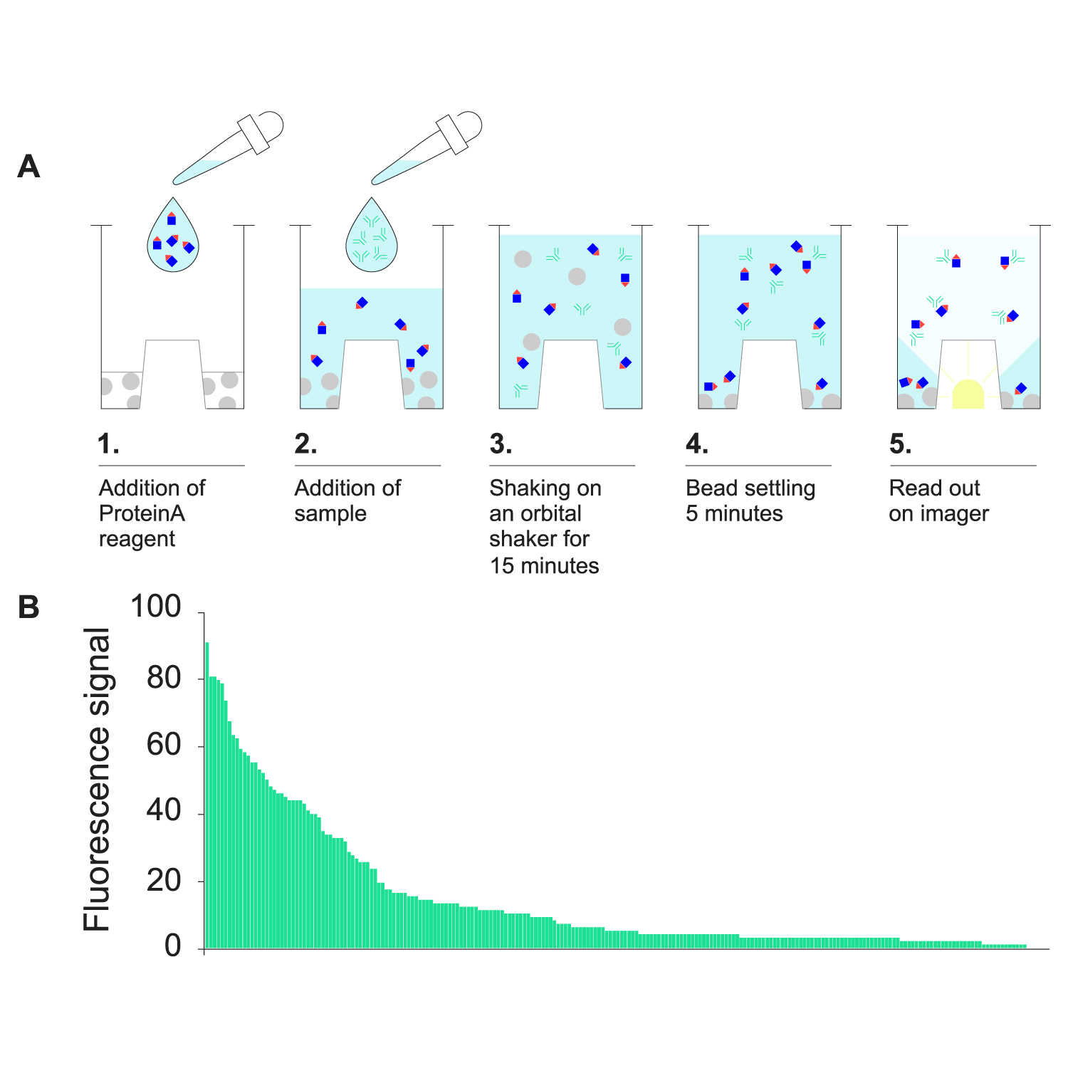 A) Schematic protocol for F.QUANT Fc Titer Assay. B) A minipool of IgG1-expressing CHO cells was dispensed into 384-well plates using the UP.SIGHT 2nd Gen. On day 10, plates were imaged and confluency determined with C.STUDIO. The top 25% clones (227 clones) were picked into 96-well plates. 3 days later, 5 μl supernatant was used for F.QUANT-based titer measurement. Ranked relative titer values are shown. Image Credit: CYTENA GmbH