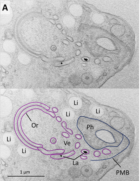 Fig.3: The interaction between colv organelles and cellular structures. A) TEM images of cells treated with lanthanoid nanocrystals (La). B) 3D reconstruction of 2 μm-thick slice from array tomography data set shows different organelles vacuoles and vesicles. Nucleus (Nu), mitochondrion (Mt), lipid droplets (Li), posterior vacuole(PV), cytopharynx (Ph) Colv organelle (Or) and smaller vacuole (Va). Image Credit: doi: 10.1128/mbio.01921-23.
