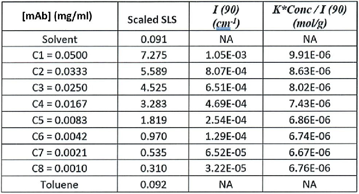 Table 1. Sample concentrations (g/ml), scaled scattering intensities Scaled SLS), Rayleigh scattering intensities (1(90) (cm-1))), and K*Conc./I(90) (mol/g). Source: Yokogawa Fluence Analytics