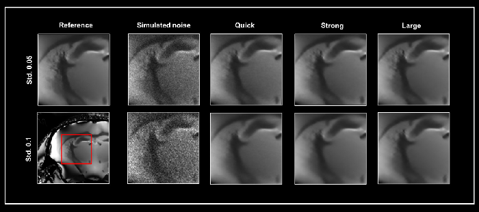 Two levels of simulated noise (Standard deviation 0.05 and 0.1) were added to the reference image, which was later utilized as input for the three denoising networks (Quick, Strong, and Large). All of the datasets were denoised with 50% pre-denoising and a 100% denoising level.