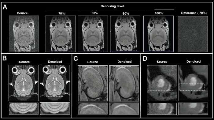 Figure 2. The effect of image denoising on image quality. A) Applying increasing levels of denoising. Shown are axial images of a 3D T1-weighted FLASH ex vivo data of a fixed mouse head acquired at 9.4 Tesla without (Source) and different levels (70-100%) of denoising. A difference image between the source and 70% denoised images was computed. B)-D) Comparison of in vivo images reconstructed with no denoising and with 70% denoising. B) Coronal T2-weighted TurboRARE images of a mouse brain acquired at 3 Tesla. C) Coronal 3D FISP images of mouse kidney acquired at 7 Tesla. D) Short axis view of a mouse heart acquired with a flow-compensated triggered FLASH sequence at 9.4 Tesla. For different data, either no denoising (Source) or denoising using individual networks and a pre-denoising of 50% was applied (Denoised). Image Credit: Bruker BioSpin Group