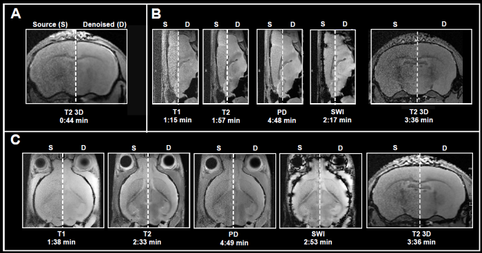 This resulted in 7-15 times faster acquisition times compared to the original protocols. Yet, given the chosen resolution, no averaging resulted in noisy images. Reconstructing the obtained data with the denoising algorithm successfully removed noise from images and delivered high-quality images.
