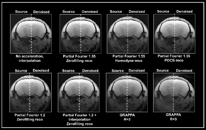 Figure 5. Denoising of accelerated brain data. Ex vivo T1-weighted FLASH data of a fixed mouse head were acquired at 9.4 Tesla. Data were either acquired with no acceleration, with partial Fourier (in Read), partial Fourier and interpolation (1.35 in Read and Phase), or with multi-coil parallel imaging technique GRAPPA. For GRAPPA, an acceleration factor (R) of 2 and 3 was chosen, respectively. Partial Fourier images were reconstructed either with zerofilling, homodyne, or POCS, as indicated. All images are shown with no denoising (Source) and after denoising (Denoised) with a Strong network, applying a pre-denoising level of 50% and denoising level of 70%. Image Credit: Bruker BioSpin Group