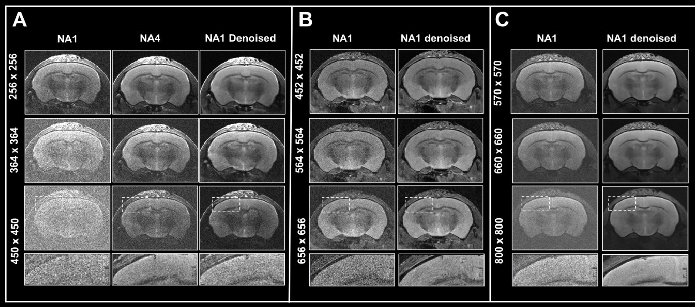Figure 6. Boosting resolution. Ex vivo T2-weighted TurboRARE data of a fixed mouse head acquired at A) 3 Tesla, B) 7 Tesla, and C) 9.4 Tesla. All images were acquired with 0.8 mm (A) and 0.7 mm (B, C) slice thickness and with a field-of-view of 20 x 20 mm2 and the given matrix size using either no averaging or acquiring 4 averages. Images were reconstructed with no denoising (NA1 and NA4), or after denoising (NA1 Denoised) using a network Large, applying a pre-denoising level of 50% and denoising level of 70%. Image Credit: Bruker BioSpin Group