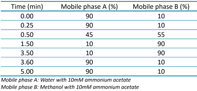 The SecurityGuard ULTRA UPLC Fully Porous PS C18 cartridge (Phenomenex part number AJ0-9508) was utilized. A flow rate of 0.8 mL/min, injection volume of 10 µL, and column temperature of 40 °C were utilized. Table 1 shows the LC gradient used.