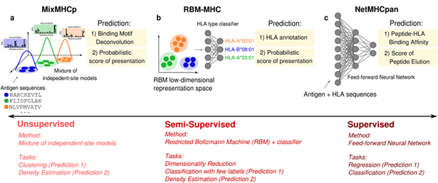 Figure 5. Examples of HLA class I antigen-presentation predictions generated by unsupervised, semi-supervised, and supervised models.10 Image Credit: Barbara Bravi.