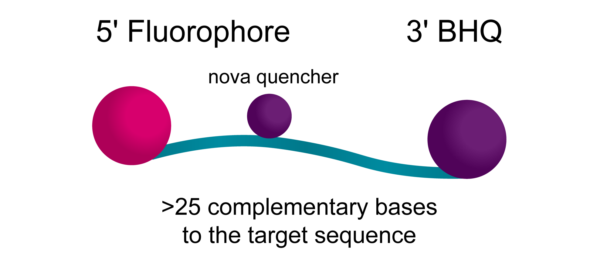BHQnova Probes are double-quenched hydrolysis probes with enhanced quenching and greater signal-to-noise ratio for long probes (>25 bases). Such probes consist of a 5' fluorophore dye, a 3' Black Hole Quencher (BHQ), and an internal nova quencher integrated between base residues 9 and 10.
