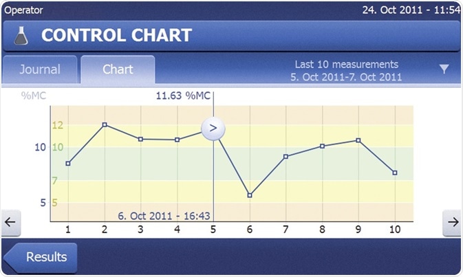 Control limits can be defined and instant pass/fail decisions per sample can be obtained along with a graphical overview with control charts for the sample series.