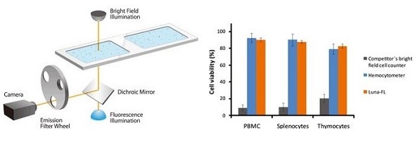 Right: Viability data using Erythrosin B with the LUNA-II, LUNA, and LUNA-FL.